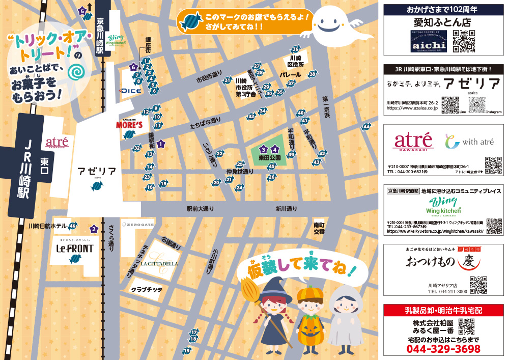 ハロウィンガイドマップは、駅前エリアの商業施設や商店街で無料配布しています。