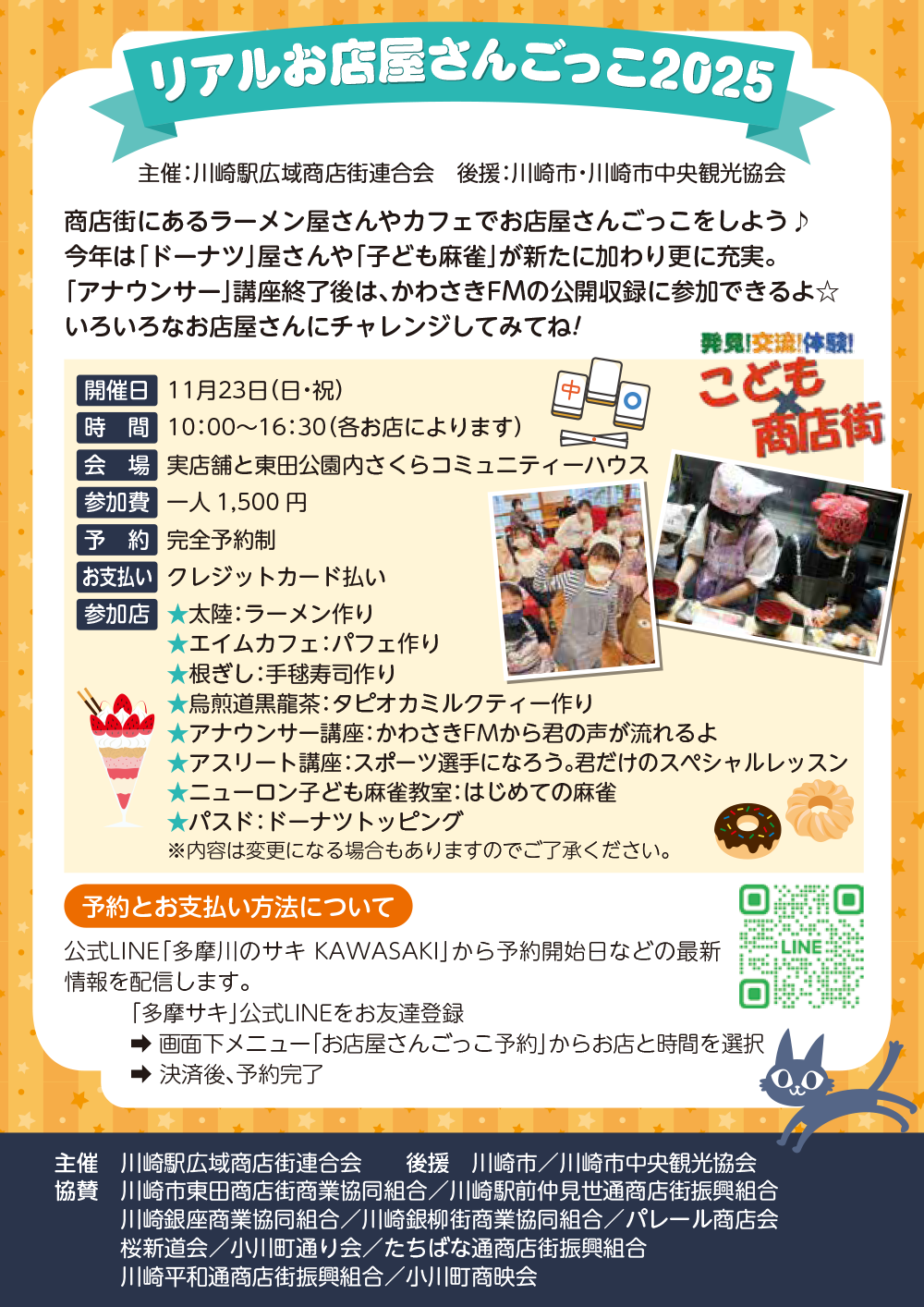 商店街にある、ラーメン屋さんやカフェでのお仕事体験を始め、今年は「ドーナツ屋さん」や「子ども麻雀」が新たに加わり、さらに充実!「アナウンサー講座」終了後はかわさきFMの公開収録への参加も⭐︎