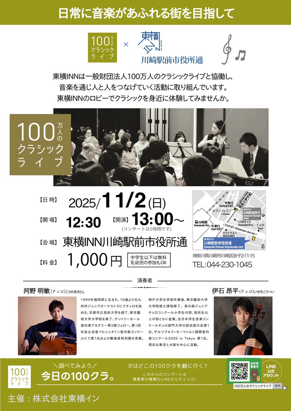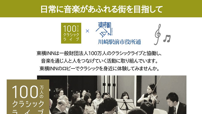 東横インは一般財団法人100万人のクラシックライブと協働し、音楽を通じて人と人をつなげていく活動に取り組んでいます。 東横インのロビーでライブを楽しんでみませんか。