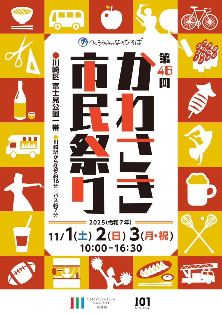 川崎イベント情報本日から11月3日(月・祝)までの3日間、第46回「かわさき市民祭り」が富士見公園一帯にて開催されます。