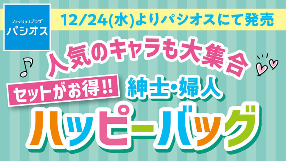 パシオス川崎ルフロン店では12/24(水)より、紳士・婦人のキャラクターハッピーバッグを発売いたします。