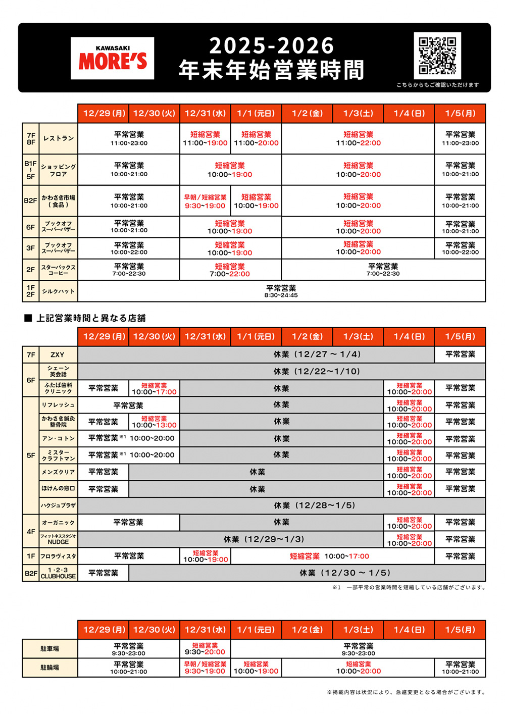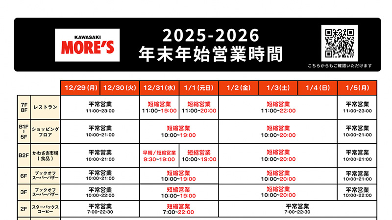 【年末年始特集2025-2026】川崎モアーズ「年末年始の営業時間」 川崎イベント情報 2025.12.22 川崎モアーズの「年末年始の営業時間」が、下記の通りに変更となります。 記載と異なる「店舗の営業時間や休業日」の追加情報や、その他詳細につきましては「川崎モアーズのホームページ」よりご覧ください。 年末年始営業時間のお知らせ(2025-2026) | イベント&ニュース | 川崎モアーズ川崎モアーズでは年末年始の営業時間を変更させていただきます。 詳しくは「2025-2026年末年始営業時間」よりご確認ください 川崎駅周辺のお店で使えるお得なクーポンやイベント情報を順次配信中! LINE公式アカウントへのご登録はこちらから!
