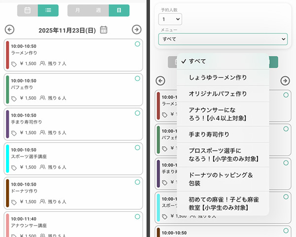 2. 人数に空きがある場合は予約可能となっておりますので、ご希望の時間帯をお選びください。