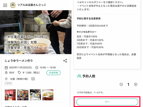 ご確認後、予約人数を選択(最大2名)して、最下部の「次へ」をタップします。