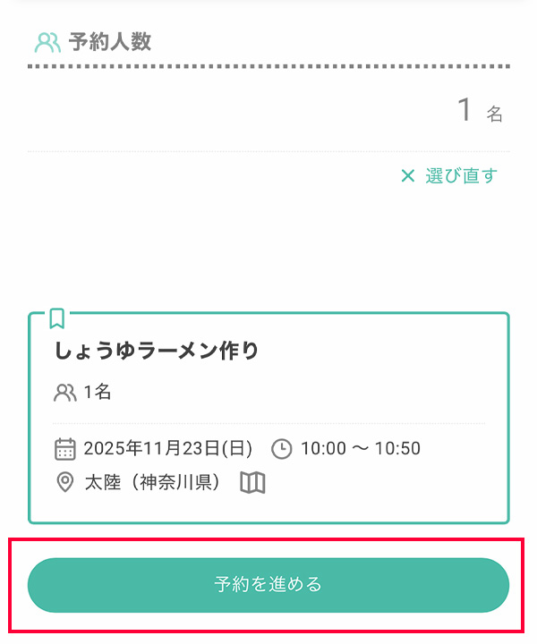 4. 予約人数と時間帯をご確認いただいたら、「予約を進める」をタップします。